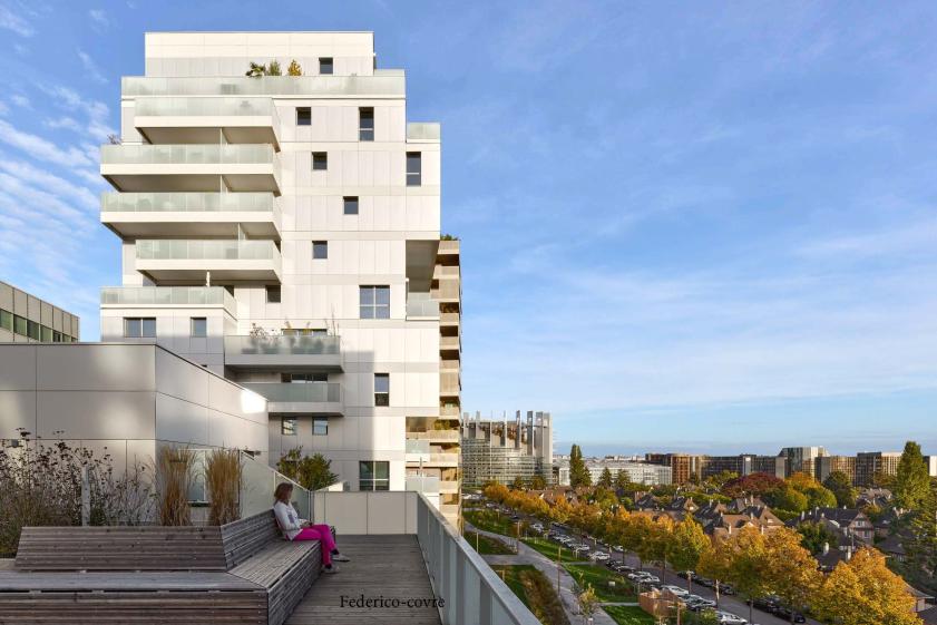 L’immeuble de logements est constitué d’un plot de 5 étages, à l’Ouest et d’une partie plus élancée de 15 niveaux, à l’Est. Ce découpage permet de s’ouvrir sur le parc et de laisser la nature pénétrer au cœur de l’îlot.