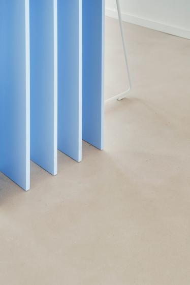 Il n'y a pas de ligne d'horizon dans cet appartement noyé dans un sol rose. Murs et sol sont liés et confondus : par les lames de miroirs, par le choix de portes toute hauteur, par un banc extrudé du sol accentuant ainsi une sensation de flottaison.