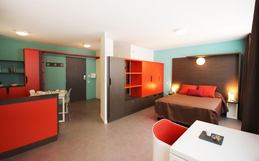 Conception et suivi de chantier pour l'aménagement des 540 chambres de la résidence eainsi que des espaces communs (design des mobiliers des chambres, banque d'accueil, bar, couleurs et matériaux,...)