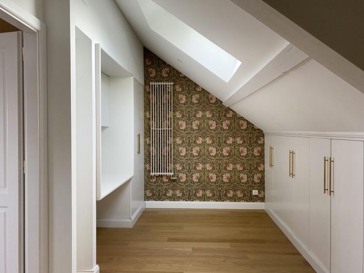 Aménager des combles est un exercice complexe car les espaces sont souvent exigus avec de faibles hauteurs sous rampants. Le cahier des charges de nos clients comportait une mezzanine, un sanitaire, une chambre, une suite avec son dressing, sa salle d'eau et son bureau, un salon cinéma et un maximum de rangements. Pour donner du sens à notre intervention, il nous fallait concevoir un projet délicat et finement dimensionné dans un style classique en cohérence avec le caractère de cette maison de maître.. Nous avons donc dessiné l'ensemble du mobilier sur mesure en pin blanchi et poignées laiton afin de constituer un fil rouge pour ces espaces. Un travail sur des touches de couleurs pastel a également permis de créer des espaces douillets et raffinés.