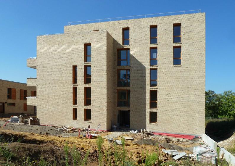 Un immeuble-plot de R+4 en bordure de voie est associé à un immeuble linéaire de logements intermédiaires de R+2 qui longe l'allée. A l'autre extrémité de l'îlot, implanté à l'alignement le long d'un espace public végétalisé, se trouve un second plot qui fait face au jardin collectif avec son aire de jeux. Enfin, la moitié ouest de la parcelle est occupée par trois bandes de maisons à patio de R+1 qui ménagent des transparences visuelles vers le terrain en contrebas.