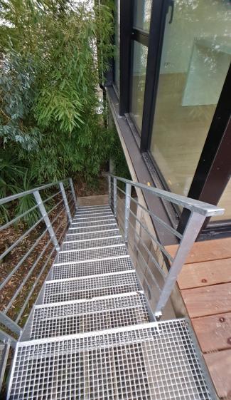 Extension séjour / salle à manger et terrasse en continuité de la cuisine à l'étage principal de la maison. Escalier galvanisé en prise directe sur le jardin.