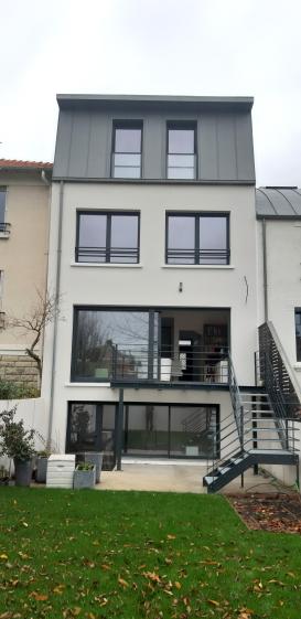 Dans un contexte bâti mitoyen dense, surélévation de la toiture permettant de gagner un niveau complet et extension horizontale sur jardin.