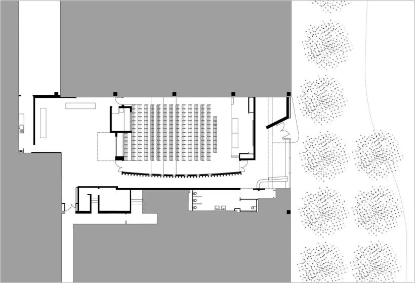 La salle de 200 places est une boite entièrement revêtue de bois dans le grand volume de ce rez-de-chaussée en béton peint : parement extérieur en bois clair et habillages intérieurs en Valchromat anthracite, panneaux de fibre de bois teintés dans la masse, lisses ou perforés pour corriger l’acoustique. Les fauteuils en tissu rouge reprennent la teinte de l’enduit du mur signal de l’entrée.