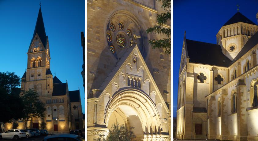 Restauration des garde-corps et des vitraux dégradés, mise en lumière de l’édifice (Bureau d’études : L’Acte Lumière).