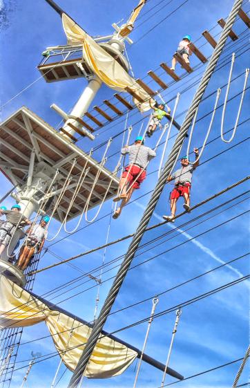 Ce projet consiste en la conception d’un parc d’aventure urbain, l’accro-mâts. La structure est posée sur les bajoyers (redans) de la double forme Louis XV dans laquelle a été construite de nombreux vaisseaux de la Marine Royale entre la fin du XVII et le début du XXème siècle. Plus récemment la double forme a accueilli l’emblématique chantier de reconstruction de la Frégate “Hermione” aujourd’hui à flot dans la forme Napoléon III à proximité. Les proportions de l’accro-mât s’inspirent de celles de l’Hermione (longueur, largeur, 3 mâts, hunes…). Le haut caractère patrimonial du site a imposé des précautions techniques particulières pour préserver l’ouvrage existant et pour le laisser visible dans son intégralité. L’accro-mât qui s’élève jusqu’à 30 mètres de hauteur permettra d’observer à 360° le panorama sur la ville de Rochefort, les marais et l’ensemble du site du Grand Arsenal allant de la Corderie Royale jusqu’au Pont Transbordeur.