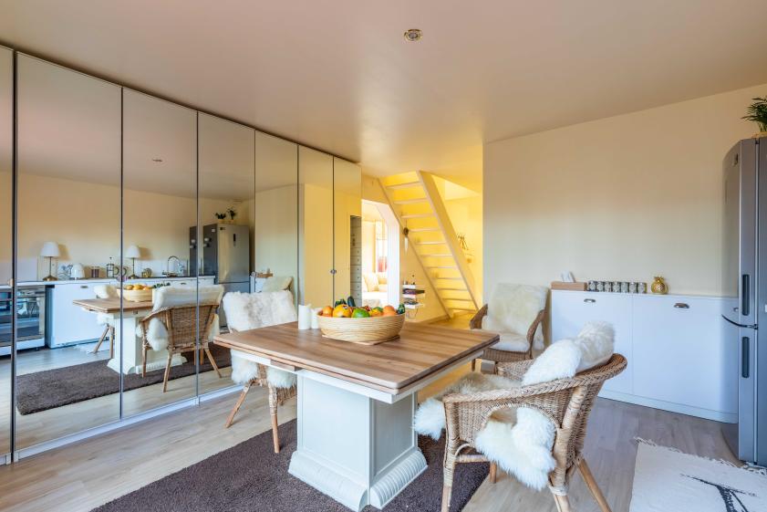 L'intérieur est composé de teintes claires et lumineuses, de multiples rangements sont dissimulés derrière des miroirs et permettent d'agrandir les pièces et offrent ainsi une clarté et une simplicité à vivre au quotidien.