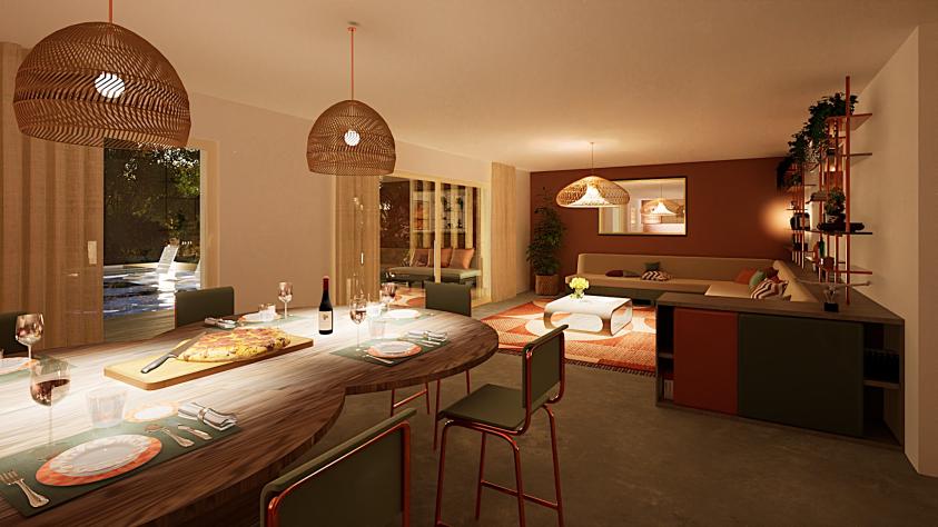 Rénovation énergétique avec aménagement des espaces intérieur et extérieur. La surélévation sur le garage a été l’opportunité de faire d’une pierre deux coups, apport généreux de lumière naturelle pour la suite parentale et création d’un préau en demi-porte-à-faux abritant la terrasse Sud et protégeant des surchauffes estivales. L’élancement et les écarts des poteaux-brises-soleil à l’ouest participent à préserver l’intimité vis-à-vis du voisinage tout en maitrisant l’ensoleillement.