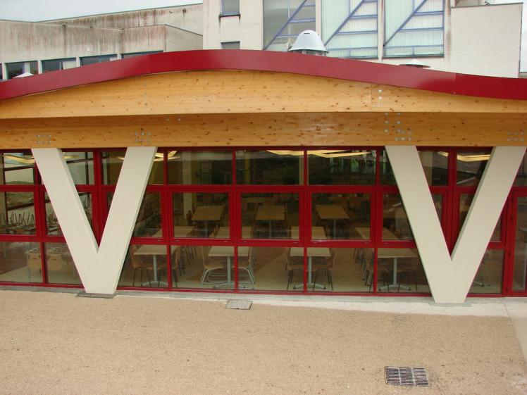 Les luminaires de conception très modernes s’intègrent à la spécificité des lieux. Le calpinage du carrelage réalisé en 3 couleurs vives découpe ce grand volume en apportant de la convivialité. Malgré l’extension, la salle du restaurant est plus lumineuse. Cette opération ouverte en septembre 2008 a atteint ses objectifs autant architectural, économique et éducatif. La réduction du temps de passage a été effective grâce à l’extension et de la mise en place d’un deuxième self plus convivial.