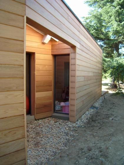 L’habillage bois en larges lames posée horizontalement a également été repris pour la porte d’entrée et les portails ainsi qu’en habillage de certaines façades de la construction d’origine.