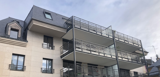 - Volumétrie sobre : R+2+combles sur parking couvert, terrasse avec garde-corps serrurerie, enduit traditionnel taloché.