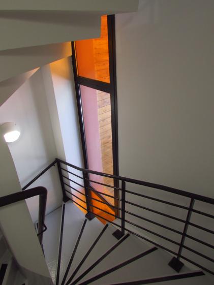 Les deux autres niveaux sont ceux des 8 logements, desservis par une coursive centrale ouverte sur une courette intérieure. La circulation verticale est assurée par un escalier commun et un ascenseur, qui distribuent tous les niveaux