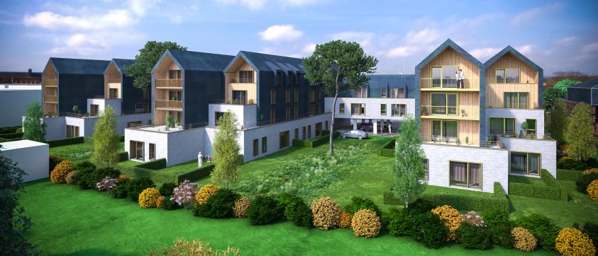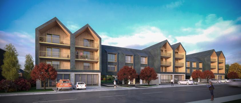 Les murs en façade sur rue, et en rez-de-chaussée sur les espaces intérieurs sont recouverts de briques de parement de teinte blanche, tandis que les murs de long pan et les toitures sont recouverts d’ardoises naturelles; les lucarnes et accessoires de couverture sont en zinc, et les pignons et loggias recouverts de lames d’épicéa rectifié.