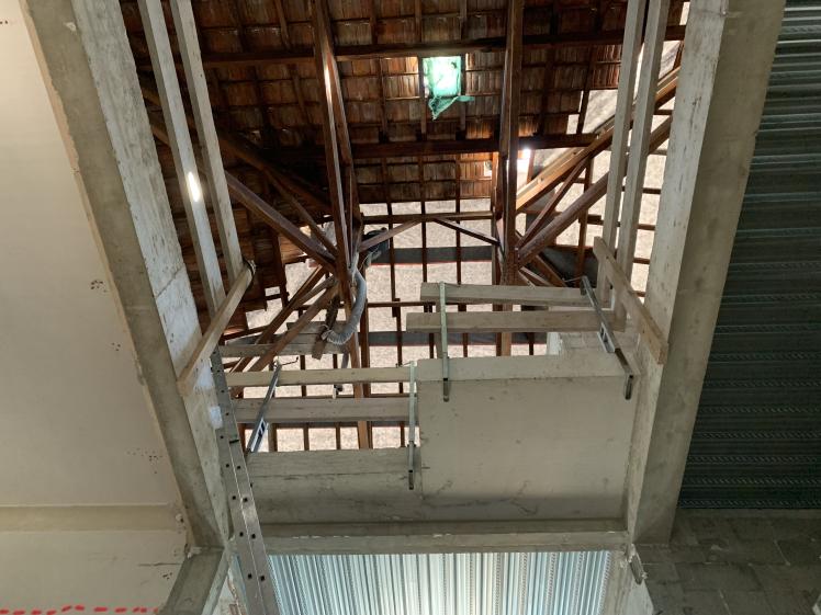 La deuxième grosse intervention a concerné la reprise complète de l’escalier entre les niveaux R-D-C et R+1, dont la configuration d'origine n’était vraiment pas fonctionnelle. Pour ce faire, l’entrée Sud-Ouest a été supprimée, et des escaliers bois/métal ont été implantés pour desservir chaque niveau depuis une zone centrale de distribution, sur laquelle donne aussi un élévateur qui a été installé à l’occasion du projet, de façon à distribuer facilement les différents locaux se trouvant à chaque étage. Sur ces zones centrales on trouve aux étages R+1 et R+2 une petite salle d’attente et des sanitaires. Le sanitaire handicapés est facilement accessible au R-D-C.