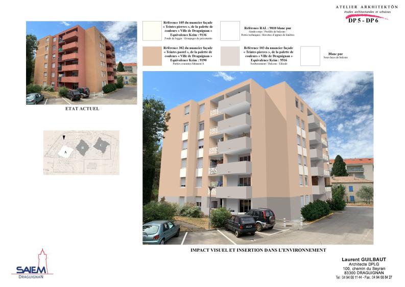 La résidence "le Loubet", composée de 3 bâtiments, le A en R+5 , le B en R+4 et le C en R+2, pour un total de 54 logements du T2 au T5 (2T2, 26 T3, 21 T4 ET 5 T5), est située sur la commune de Draguignan , 284, chemin de Sainte Barbe. Elle a été construite au début des années quatre-vingt (projet conçu par l'architecte Daniel Mathieu, chez qui j'avais fait mes premières armes). Un simple ravalement des façades avait été réalisé il y a une vingtaine d'années avec des tons assez vifs choisis par mon confrère Bruno Goyeneche et les anciennes menuiseries et fermetures avaient été changées plus récemment pour des équipements plus performants, ce qui constituait déjà une première amélioration thermique.