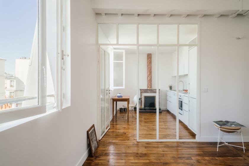 Une cloison en verre et en acier sépare à la fois la nouvelle cuisine du séjour et créer une échappée visuelle vers une fenêtre donnant sur les toits parisiens.