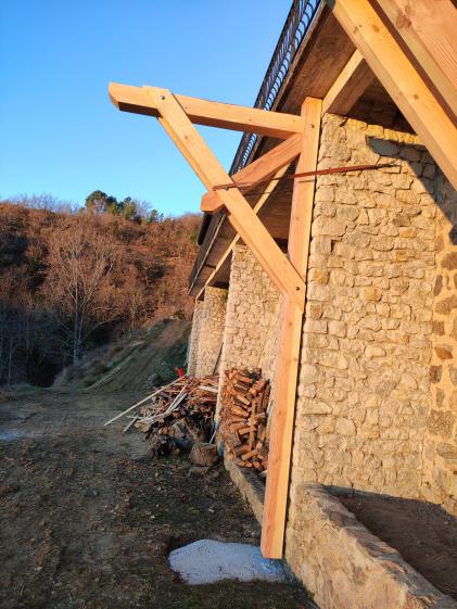 Un balcon étroit existant permet de relié au sud les 2 bâtiments, il est agrandi sur une partie en bois type douglas, tenu par des consoles/poteaux bois.
