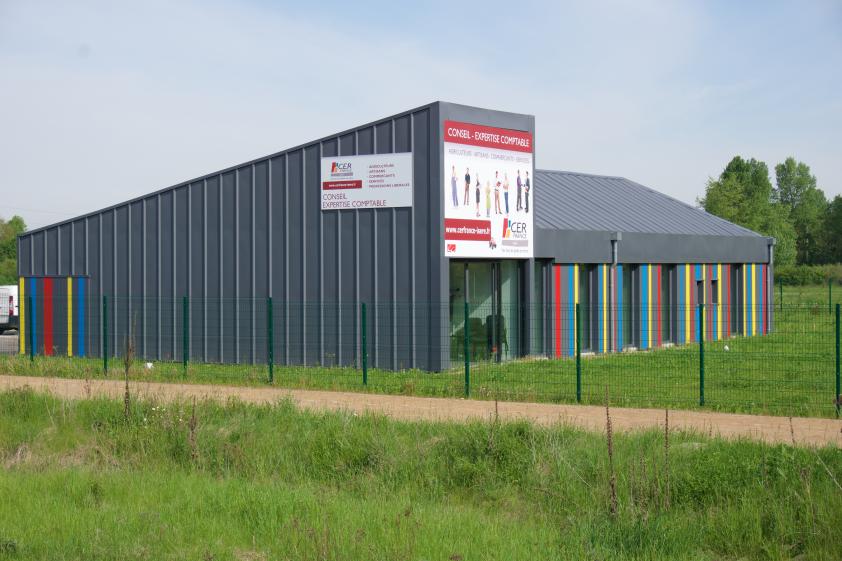 En finition bac acier de teinte gris sombre et afin de rythmer les façades extérieures, des bandes de métal coloré habillent les ouvertures des bureaux et rappellent l’identité de la société.