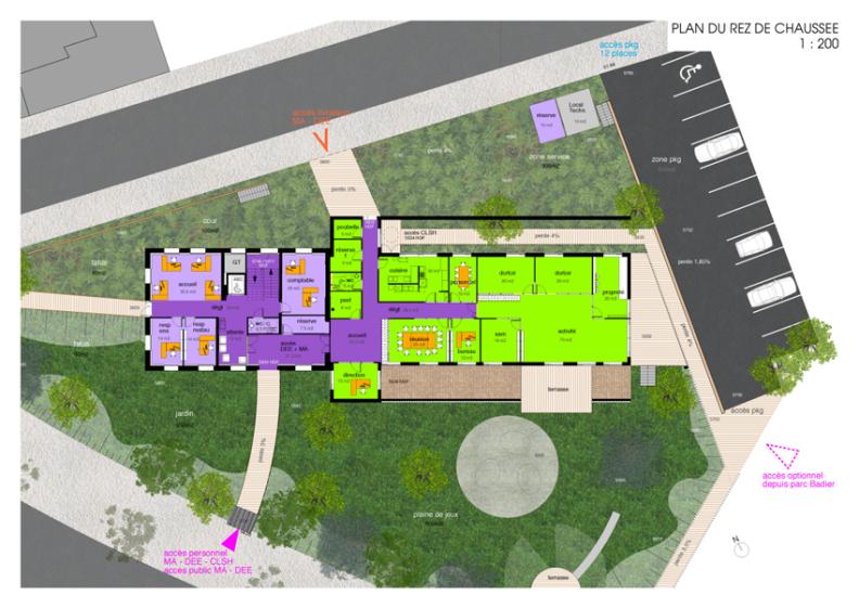 Installée au sud-est du terrain, la partie neuve en extension abrite le centre de loisirs et le multi-accueil permettant des prolongements extérieurs dédiés aux enfants est.
