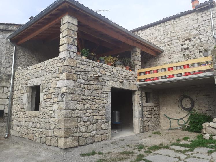 La terrasse a été construite en hauteur pour être de plein pied avec la maison. Elle offre un vaste espace ombragé et frais en été. Le rez-de-chaussée accueillera dans un second temps un studio / atelier / cuisine d'été.