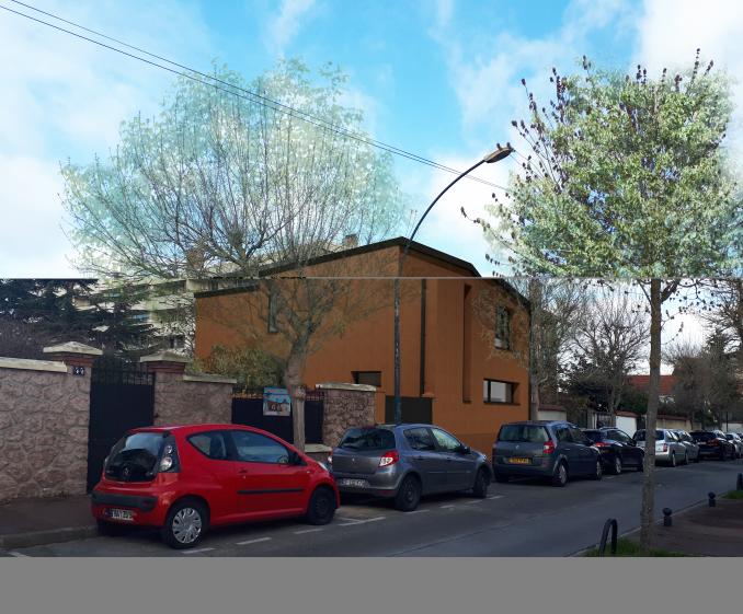 Surélévation et extension d'une maison existante avec une réécriture contemporaine de la construction. L'emploi d'un enduit ton brun permet de rappeler les constructions en briques environnantes.