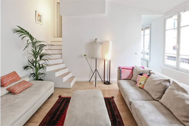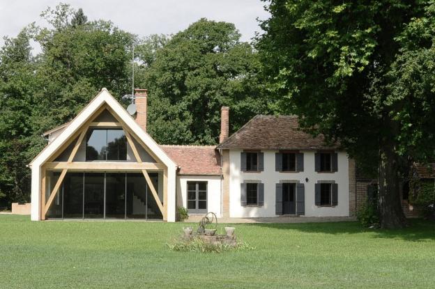 Les poutres et la charpente ont été découvertes et mises en valeur par la double hauteur créée dans la pièce à vivre.