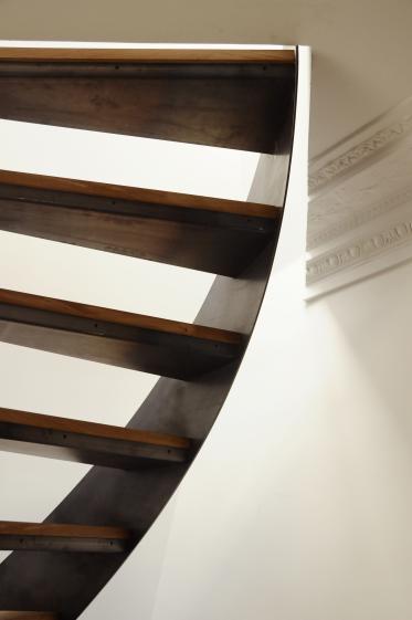 Aménagement des combles sous un dôme Haussmannien. Une chambre est créée, accessible par un escalier se glissant le long des parois du dôme.