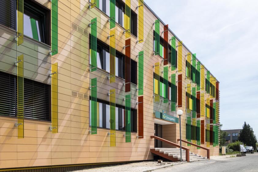 - Brises soleils verticaux vitrés et colorés créant des masques tout en animant les façades.