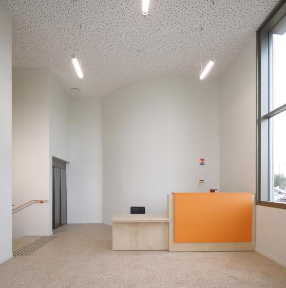Un nouveau volume d’entrée en extension a été créé, ouvert sur la place. Commun à tous les usagers, il contient un ascenseur, un bureau, un vestiaire et un petit espace d’accueil dont la paroi courbe signale l’accès aux espaces sportifs.