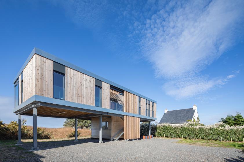 Les fondations sont réalisées au moyen de 12 pieux vissés dans le sable. Le terrain reste totalement perméable à l’eau. Un puit perdu récupère les eaux pluviales. La charpente et le bardage sont en douglas non traités ou en panneaux d’okoumé bruts au RDC. L’isolation extérieure est en panneaux de fibre de bois. Les dalles sont en bois et les sols en parquet chêne. Les menuiseries sont mixtes bois-alu en triple vitrages. La ventilation est double-flux et le chauffe-eau solaire. Des panneaux solaires préchauffent l’eau chaude sanitaire et la ventilation double flux, seuls les sèches serviettes chauffent occasionnellement les salles d’eau. La structure primaire en acier galvanisé permet l’économie de matière et favorise une résistance optimale.