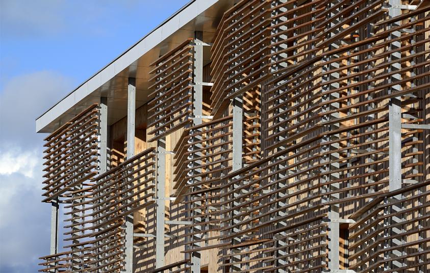 Le volume est constitué d’un socle béton au niveau rez de chaussée bas et de façades en bardage bois pour les 2 niveaux supérieurs (bardage vertical). Les façades des deux niveaux supérieurs seront doublées d’une peau bois identique à celle qui recouvre la partie restructurée, positionnée entre deux casquette, qui joue le rôle de brise soleil et se densifie ou s’émousse en fonction des façades plus ou moins exposées (dense au sud, plus aérée à l’est et l’ouest, et complètement libérée au nord). Cette seconde peau, décollée de la façade du bâtiment, préserve les vues et perspectives visuelles sur le paysage lointain.