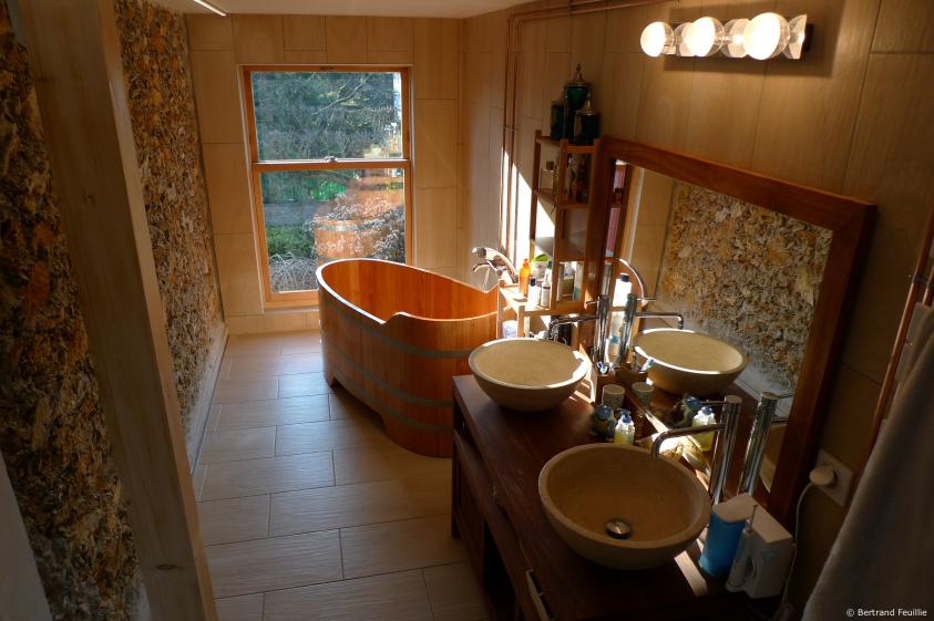 Après la démolition d’une annexe existante et la restructuration des réseaux, la logique de croissance de l’extension vise à la fermeture de la façade nord par un volume technique de pièces humides superposées constituant un espace tampon isolé sur une mitoyenneté aveugle.