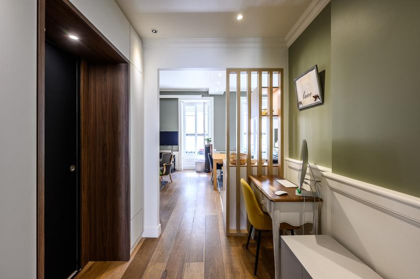 Nous sommes donc intervenus pour concevoir des ameublements sur mesure permettant de redéfinir l’espace du couloir, de l’entrée et des distributions des autres pièces. L’espace non aménagé a été aussi revu et la cloison avec la chambre modifiée pour permettre de créer une pièce bureau/chambre d’ami. Chambre dans laquelle un grand dressing a là aussi été dessiné pour augmenter les capacités de rangement.