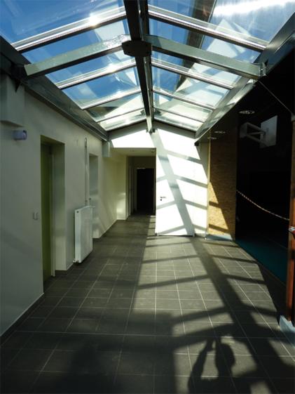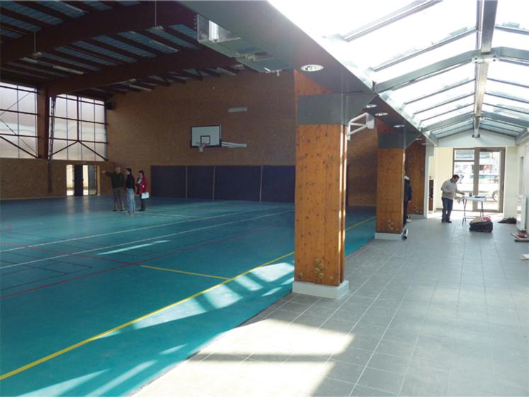 Le projet consistait à réhabiliter, isoler et agrandir le gymnase existant. La grande salle de sport a été totalement réhabilitée (polycarbonate remplacé, murs isolés et habillés par des panneaux triple, couverture et étanchéité refaites intégralement, éclairage et sol remplacés). Une nouvelle entrée abritée d'un auvent a été créée, prolongée par un dégagement éclairé naturellement par une grande verrière. Les vestiaires et sanitaires ont été entièrement réhabilités et mis aux normes pour les personnes à mobilité réduite, ainsi qu'isolés par l'extérieur et habillés de panneaux rouges. Un local rangement a été créé en extension, isolé par l'extérieur et habillé de caillebottis métallique.