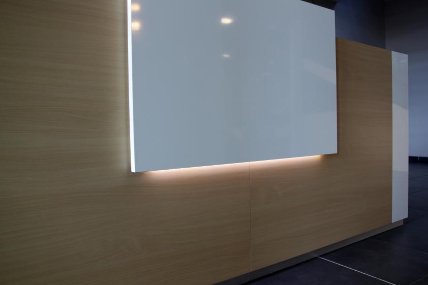 Réaménagement des espaces d'accueil et de convivialité à Lyon. Inclus création du mobilier sur mesure (banque d'accueil, aménagement de l'espace sous l'escalier).