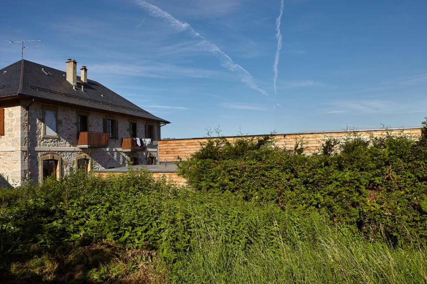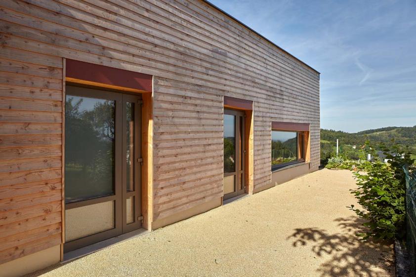 Matériaux : Structure bois ; menuiseries bois ; bardage en bois douglas ; couverture avec une membrane d’étanchéité (Sarnafil). Isolation : ouate de cellulose insufflée.