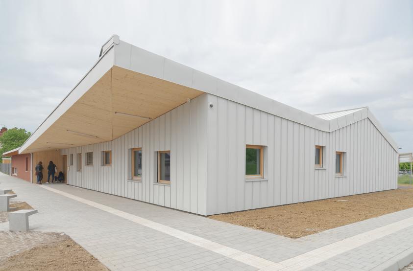 La toiture est habillée de Prefalz qui se prolonge sur les façades façades exposées. Les façades en contact avec les enfants sont traitées en enduit à la chaux et sont protégées par un fin débord de toiture, permis par des gouttières havraises.