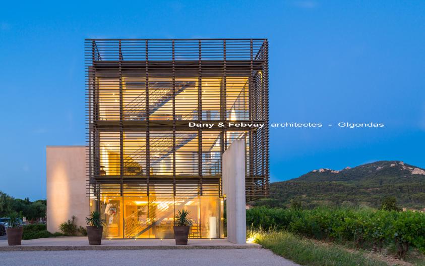 Au pied des Dentelles de Montmirail, surplombant le célèbre vignoble de Gigondas, la construction contemporaine élevée sur 3 niveaux allie le bois, le béton, l'acier et mise essentiellement sur la lumière et les transparences. Conception et Maitrise d'oeuvre.