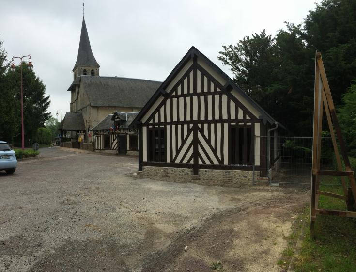 Mise aux normes accessibilités et extension (salle de réunion) de la mairie de Clarbec en colombage, soubassement en silex, couverture en ardoises naturelles, isolation en panneaux de fibre de bois.