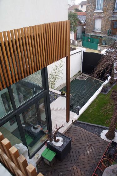 L’isolation de la façade conservée au RDC est revêtue d’un bardage bois et du portique marquise, offrant ainsi un fil conducteur entre les différentes façades. Le bardage présente une progression de sa hauteur, permettant de marquer l’emprise de la terrasse, de souligner la toiture à deux pentes (dominante dans la zone).