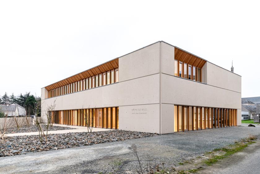 Création du nouvel hôtel de ville d’Héric, entre bâtiment public institutionnel et objet minéral singulier.