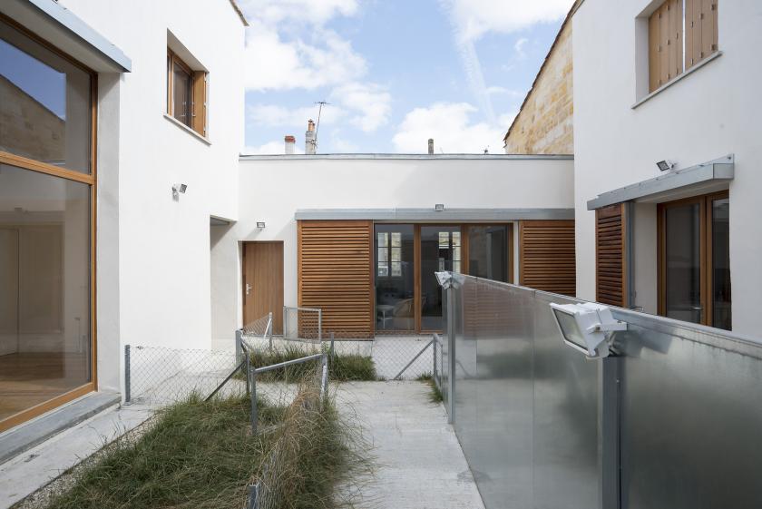 L’unité foncière, dans le quartier historique de Bordeaux, est composée de plusieurs corps de bâtiments. La première étape du projet a été de dégager le cœur d’ilot pour permettre la création de quatre maisons de ville en périphérie. L’enveloppe extérieure des bâtiments, en pierre de taille, a été soigneusement rénovée à l’identique alors que le centre de la parcelle a été conçu de sorte à ce que les logements créés bénéficient d’un confort accru : larges baies vitrées protégées de volets, jardinets privés agrémentés de cabanons, accès indépendant depuis la rue pour rentrer vélos et poubelles notamment. Les matériaux de construction utilisés, briques alvéolaires, enduits à la chaux, huisseries extérieures en bois sont qualitatifs et pérennes. Les logements, tous différents, sont lumineux et largement ouverts sur l’extérieur. Les sols en pin massif et les menuiseries intérieures en bois apportent une qualité supplémentaire.