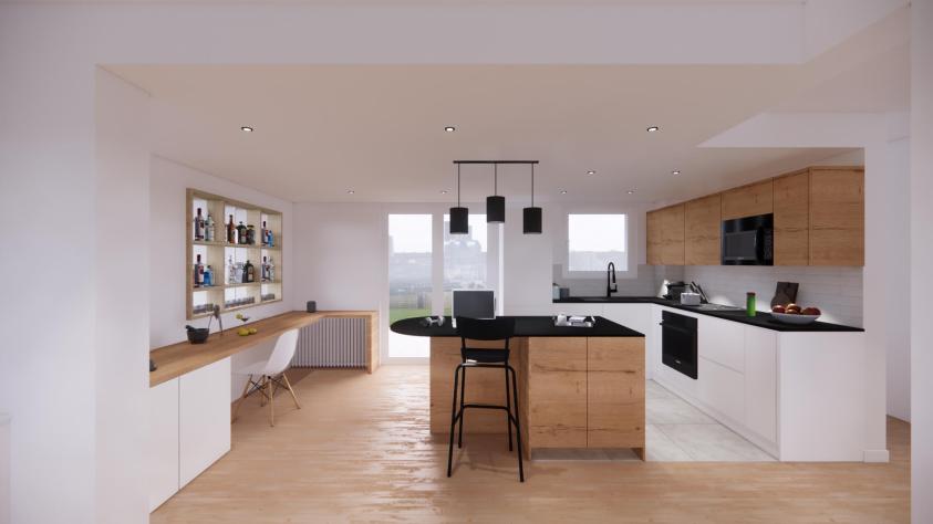 L’objectif de ce projet était d’ouvrir la cuisine sur le reste de la maison afin de créer un espace convivial et agréable. La nouvelle cuisine a été réfléchie afin de correspondre entièrement aux besoins et envies du client. Un meuble sur mesure met en valeur l’ouverture existante en briques de verre et permet l’aménagement d’un coin bar.