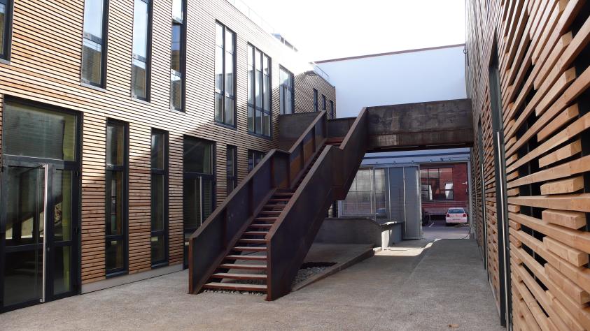 Projet de création d'un hôtel d'entreprise dans une friche industrielle remarquable de DMC. Le bâtiment 33 construit en 1928/29 est transformé en locaux locatif pour des entreprises. Nous avons créé deux patio de circulations verticales et de distribution permettant de scinder le bâtiment de près de 5000m2 en plusieurs plateaux aménageables. Le Corten des escaliers et les façades bois (mélèze) répondent aux briques parfaitement posées de cette très belle unité architecturale.