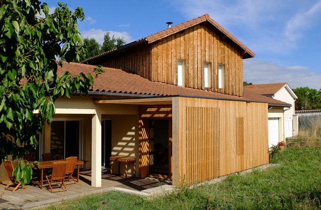 Cette extension offre un espace convivial de repas à cette famille de cinq personnes. Le projet se présente comme un paravent de bois (tasseaux à claire-voie) dissimulant ouvertures et terrasse ombragée.