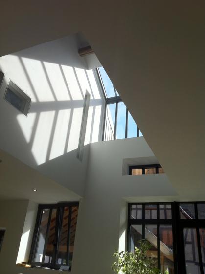 Les seules interventions visibles sont : Une «encoche » en toiture qui permet d’implanter un percement sur le haut de la façade se retournant en verrière sur le toit. Ce dispositif correspond à l’intérieur à une double hauteur articulée avec l’escalier qui permet d’accéder au niveau 1. L’implantation de fenêtres de toits, les percements existants sur la façade sud sont conservés dans leurs dimensions et les châssis sont remplacés, la partition s’inspire de celle que l’ont trouve souvent sur les châssis d’ateliers. Les tuiles existantes sont remplacées, le grès existant en façade est conservé. le mur de clôture est nettoyé et le portail restauré et motorisé. L’appentis est redressé et raccourci.