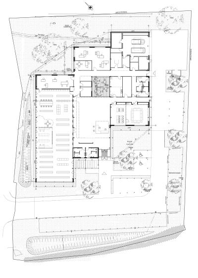 au centre, les espaces d’accueil et d’expositions, complétés, en retrait, par des espaces de travail et bureaux ; au Nord-Ouest, visible depuis la départementale, la salle des collections et enfin, au Sud-Est, les salles de réunions et de formations.