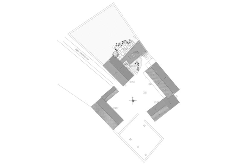 Imperceptible depuis le chemin d’accès, le projet consiste en la restructuration de l’ancienne grange (Kaludi) et l’implantation d’un volume en bois et verre, en lieu et place du mur de clôture du verger.