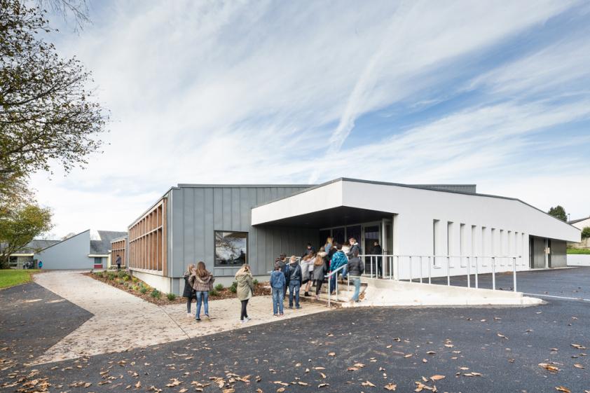 Caractéristiques : 3 salles de restauration indépendantes : maternelle, primaire et collège avec circuits distincts ; bâtiment compact, niveau BBC, construction mixte bois béton, toiture caisson bois, bardage zinc et enduit ; toiture zinc et membrane sarnafil ;