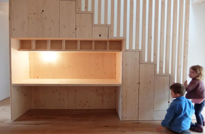 la salle de jeux est décloisonnée dans la continuité de la chambre afin favoriser une fluidité de l’espace et de la lumière et des panneaux coulissants permettront des moduler les volumes en fonction des besoins des futurs usagers. De plus des rangements ont été intégrés dans le mobilier pour améliorer le confort d’usage. La requalification de cette grange cherche à privilégier les économies d’énergie et le confort d’usage tout en favorisant des matériaux durables avec de faibles émissions de COV.